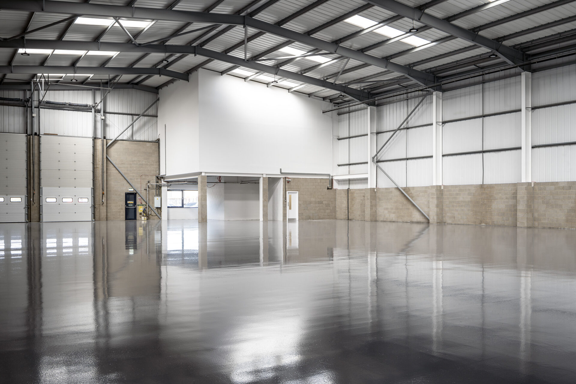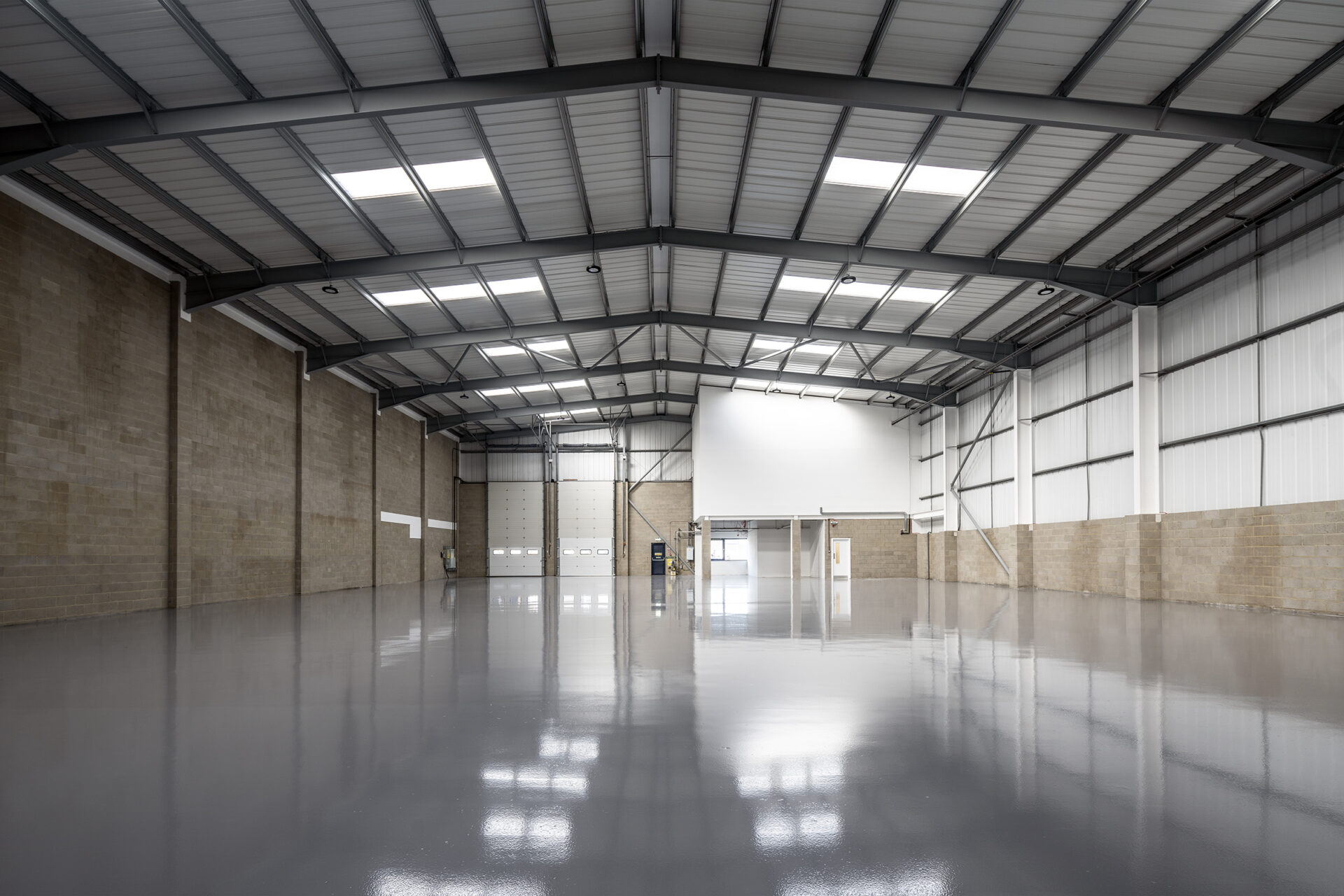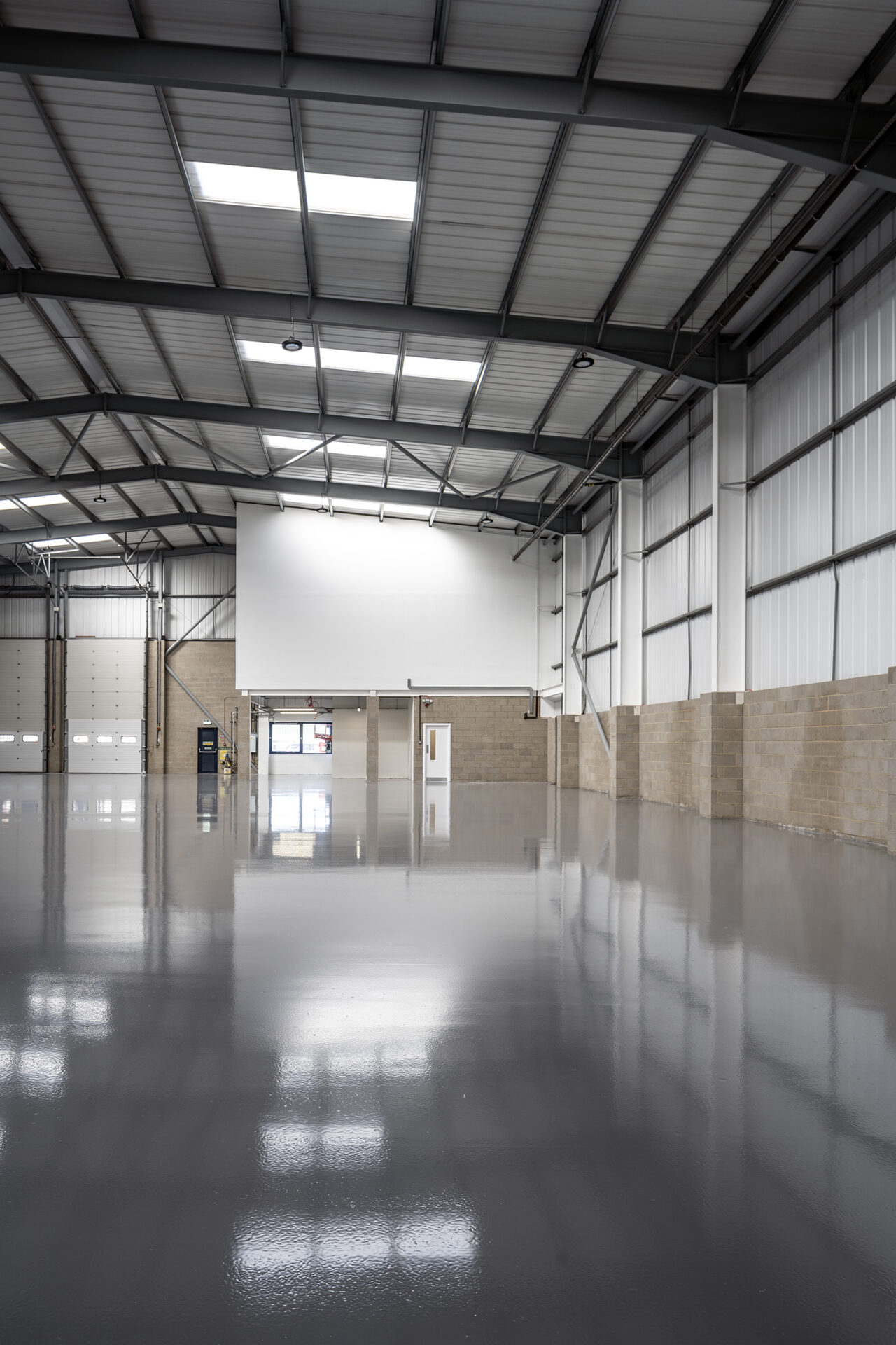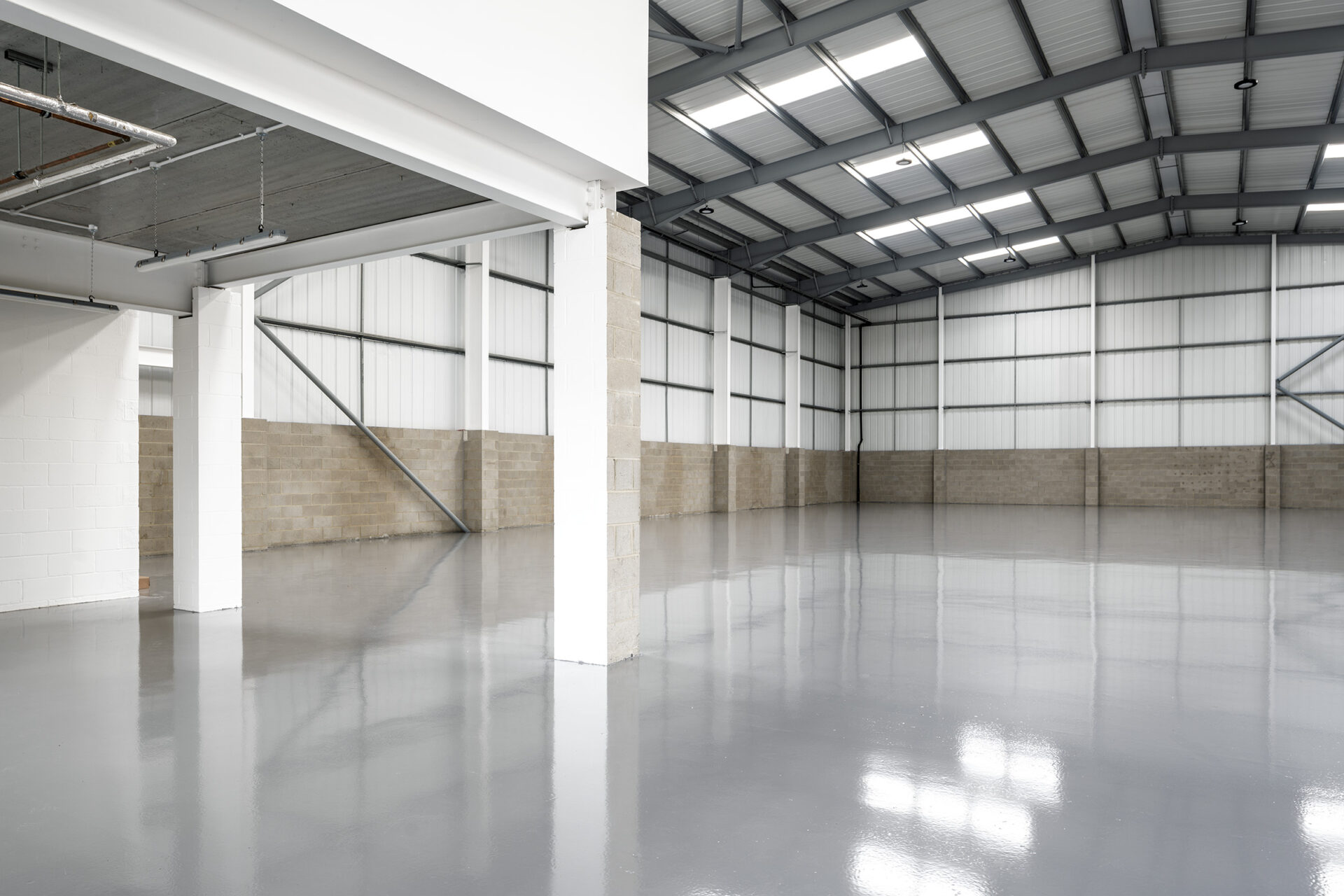 Works included the strip-out of ground floor offices, full internal redecoration, and installation of new carpets. Roof lights and damaged cladding were replaced, with weathered panels cleaned and treated. New suspended ceilings were fitted in office areas, shutter doors were repaired, and a durable resin floor was installed across the warehouse.