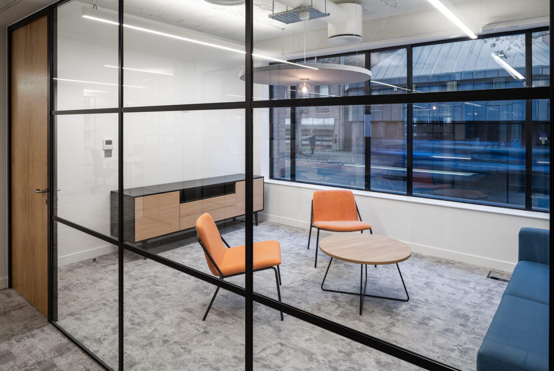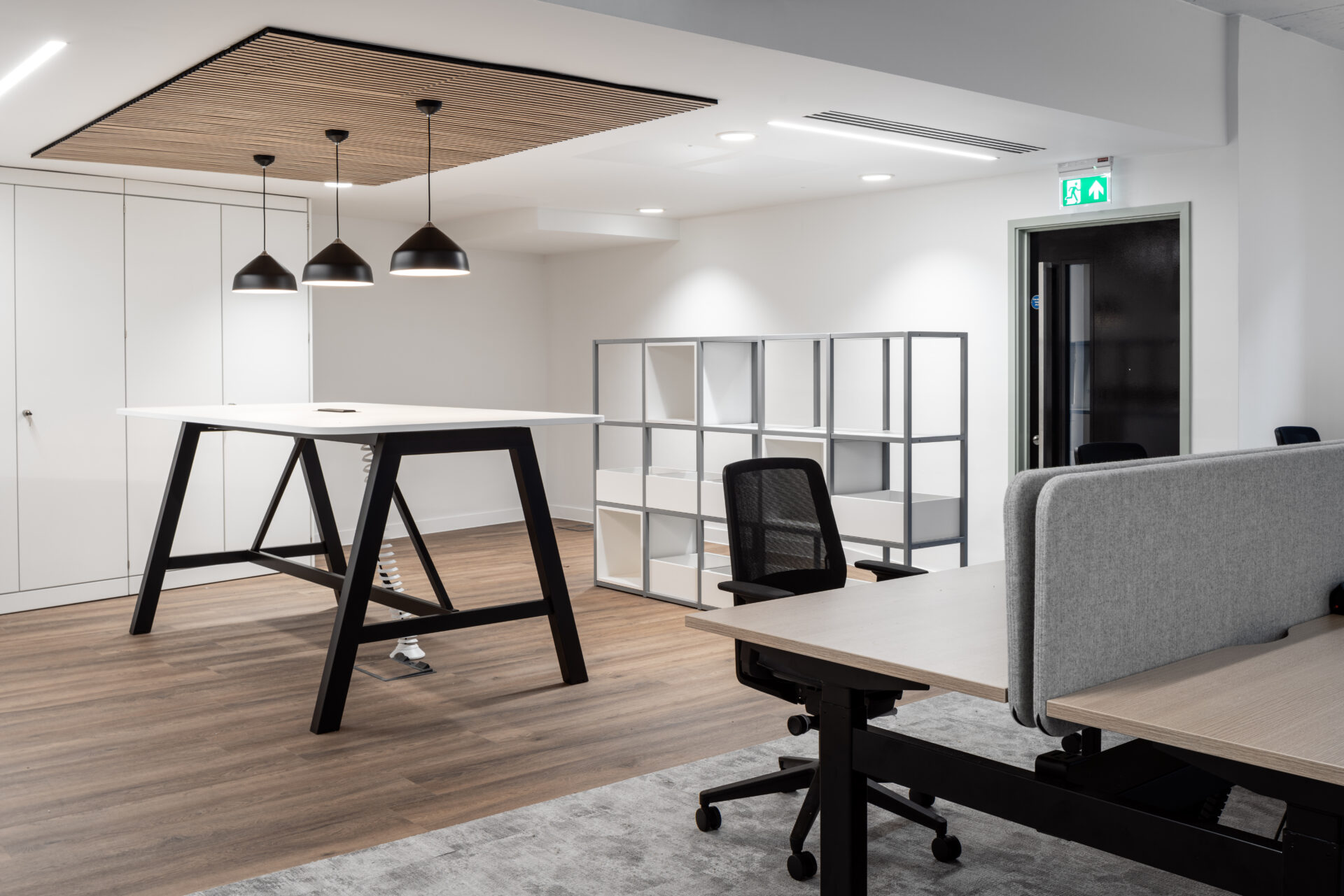 Our design incorporates open-plan desking, formal and informal meeting spaces, a T-point, and distinct zones marked by carpet and vinyl flooring.