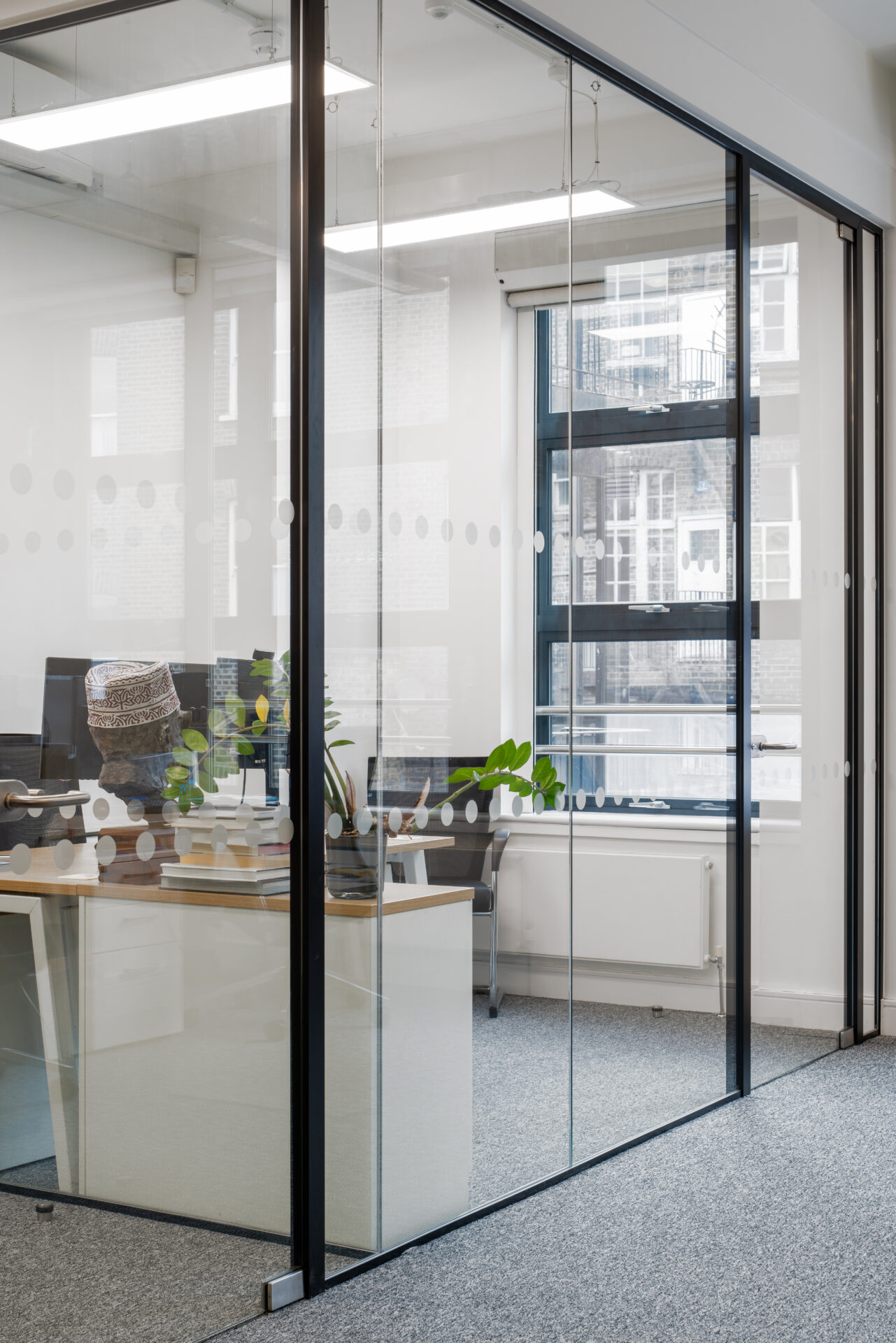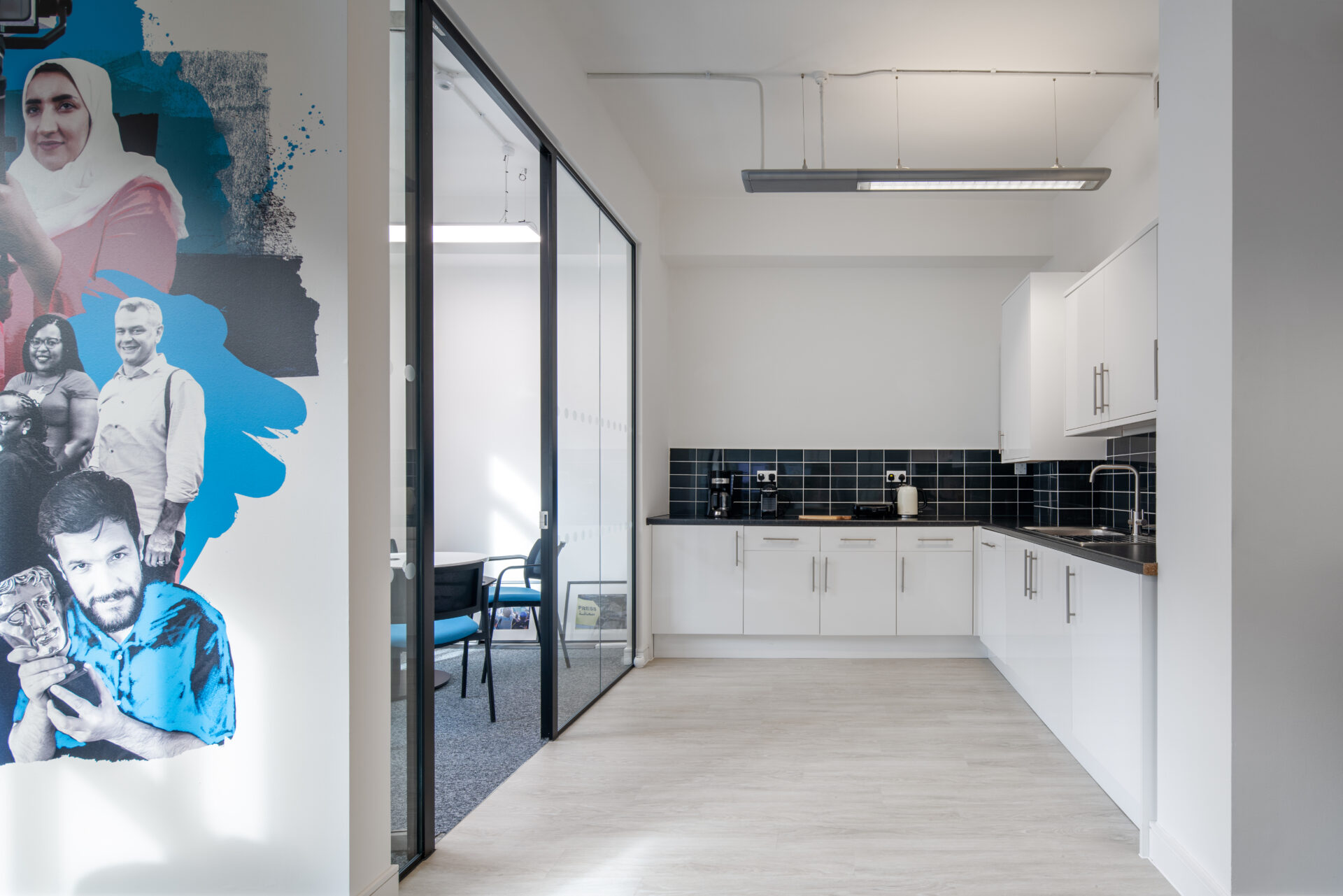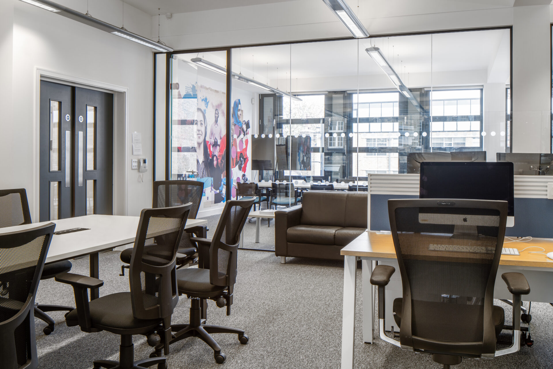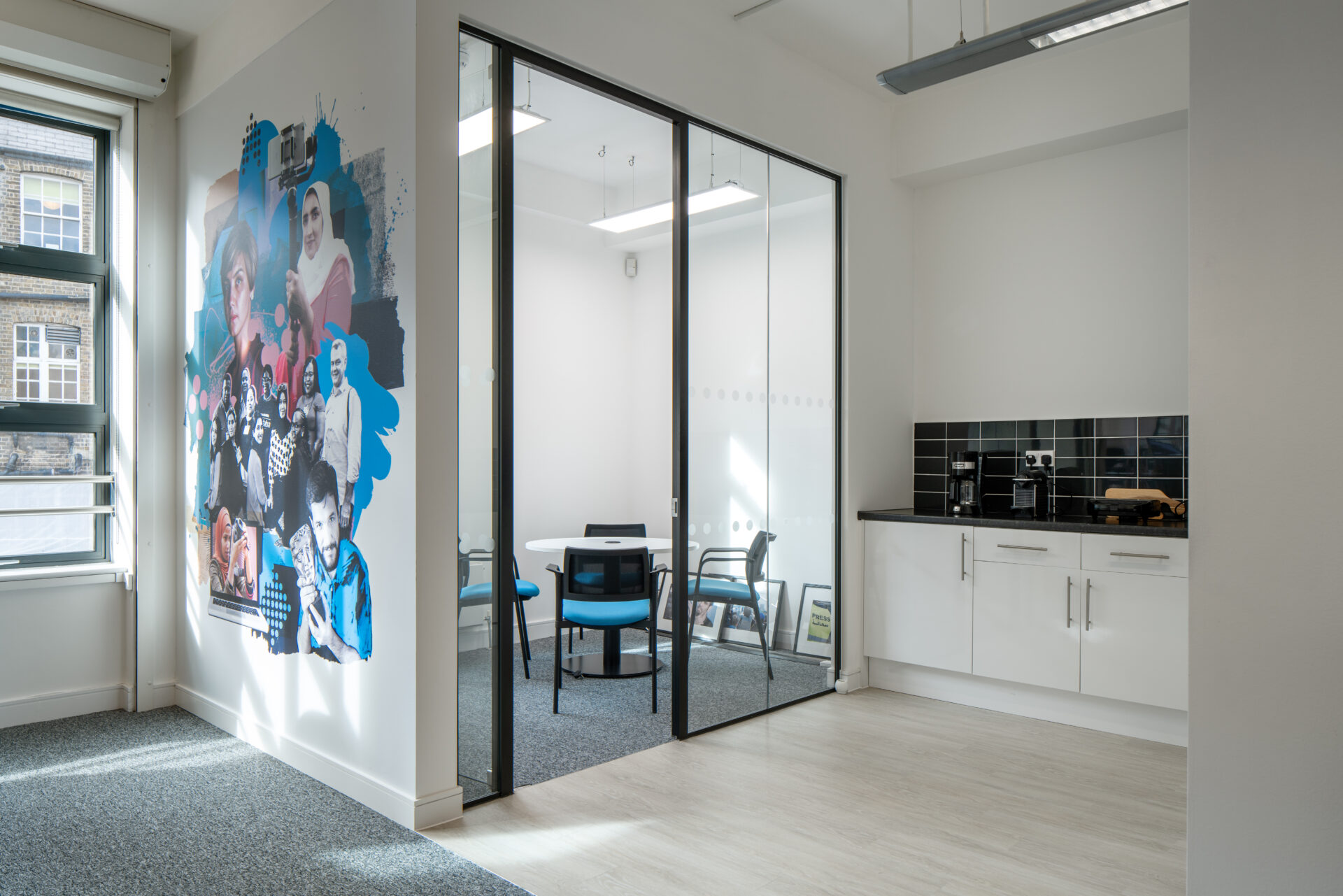 Custom large-format wall coverings and a branded Store Wall bring Thomson Foundation’s identity into the space, making this office fit-out in Camden both practical and visually aligned with their brand.